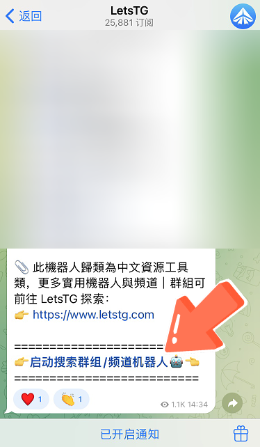 关注频道后,根据频道内容提示,点击启动LetsTG搜索群组/频道机器人,进入搜索引擎小程序: